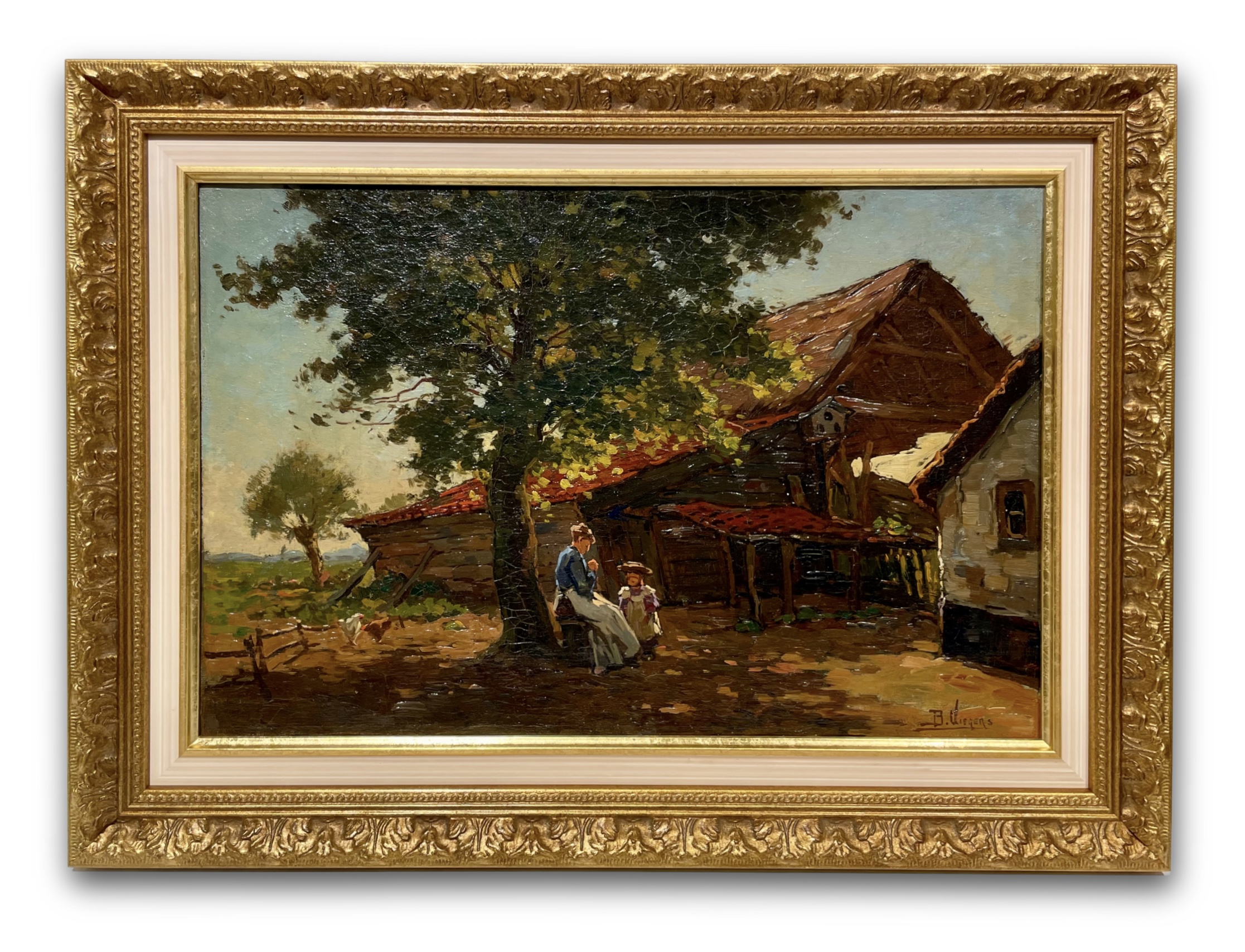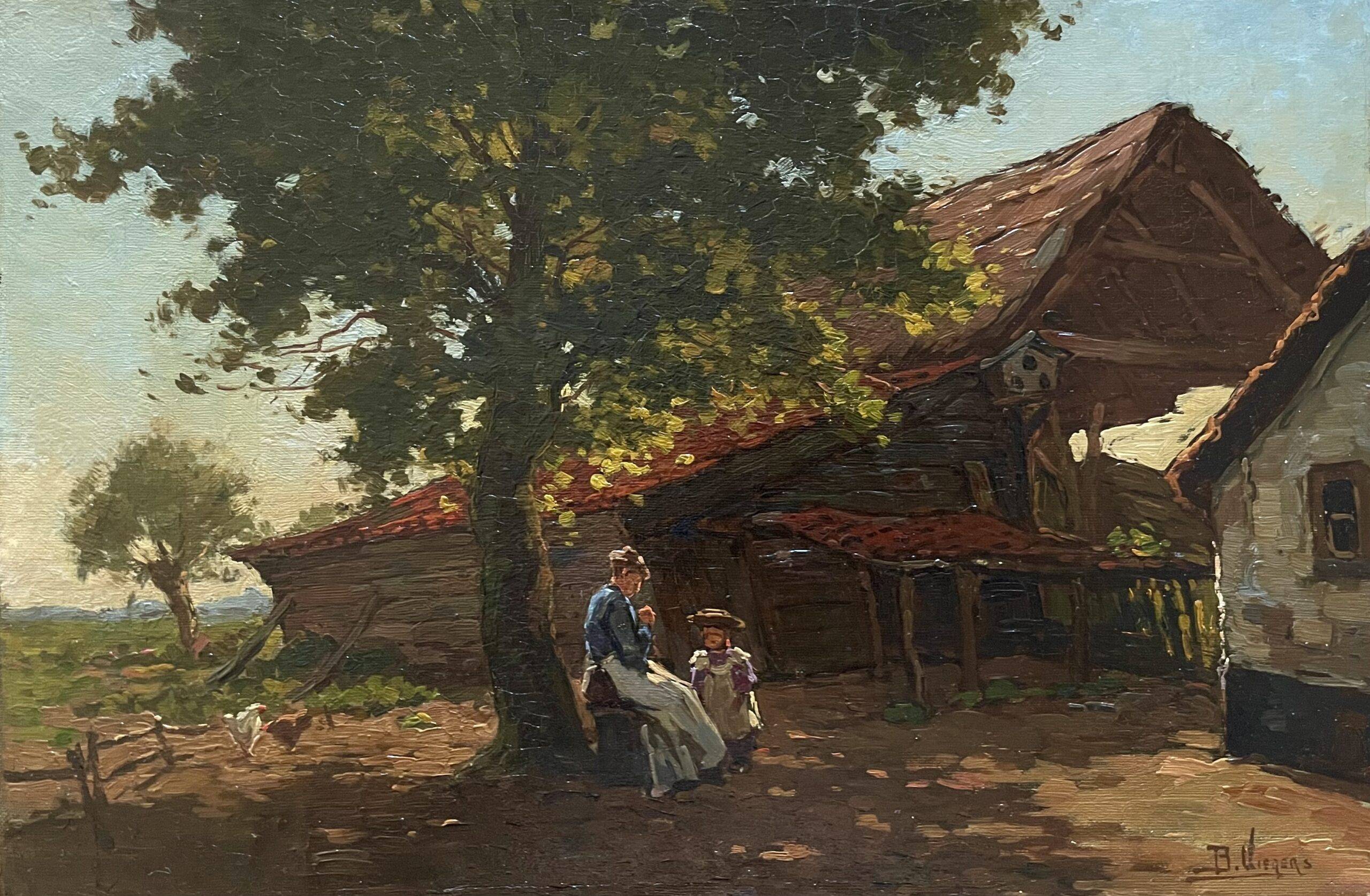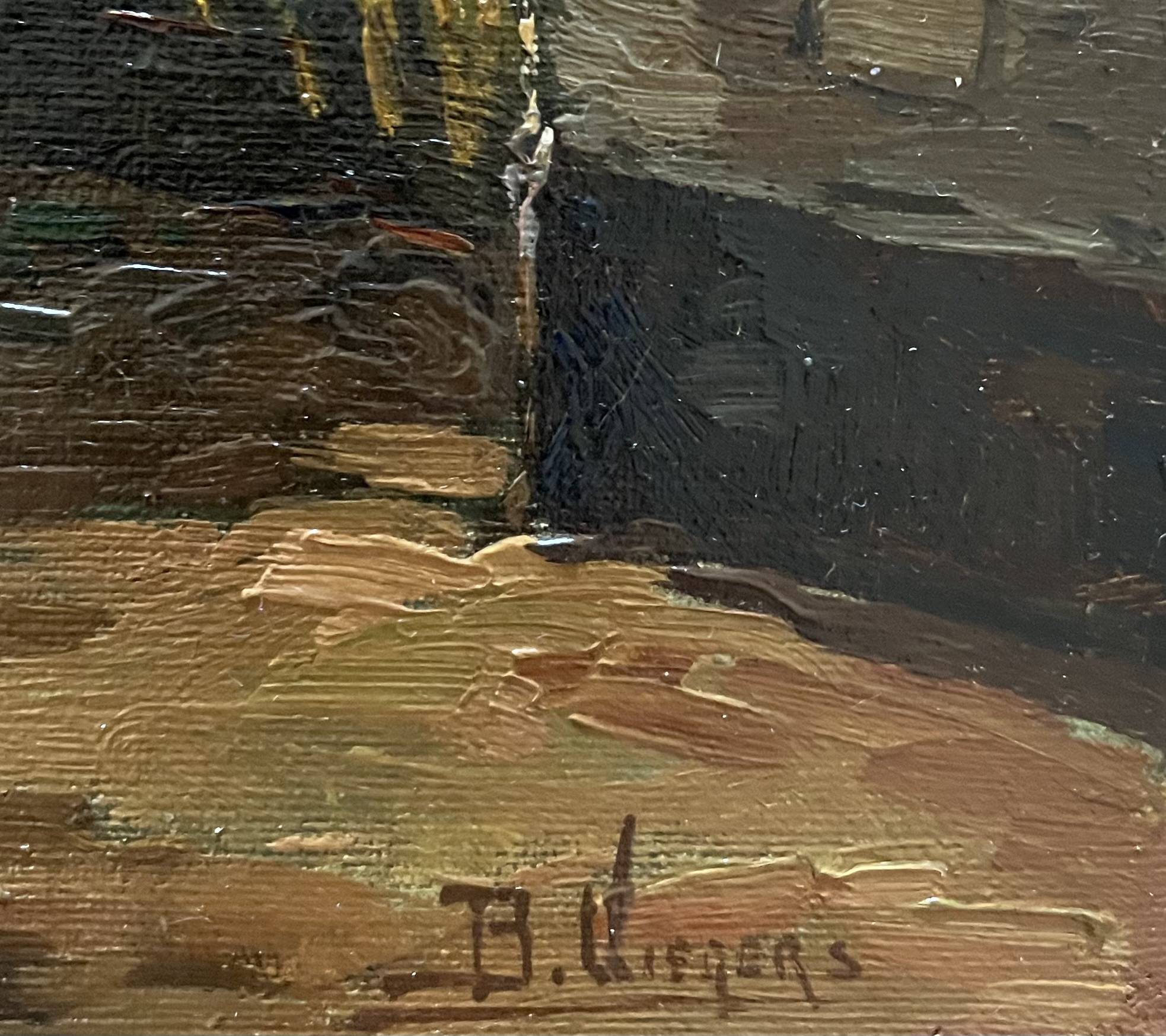 Ben Viegers (1886–1947) was een veelzijdige Nederlandse schilder die zijn wortels had in de Haagse School, maar zich ontwikkelde tot een kleurrijk impressionist met een eigen signatuur. Zijn werk kenmerkt zich door een levendig palet met kleuren als oranje, zeegroen en kobaltblauw, en een lichte, losse toets die het licht en de atmosfeer van het moment vastlegt. Hoewel hij vooral bekendstaat om zijn Veluwse landschappen en boereninterieurs, schilderde hij ook stads- en strandgezichten, waaronder het schilderij van een Schevenings straatje dat u hier kunt bewonderen. Viegers werd geboren in Den Haag en kreeg zijn eerste schilderlessen van zijn grootvader. Later studeerde hij aan de Academie van Beeldende Kunsten in Den Haag, waar hij onder invloed stond van zijn leermeester Charles Dankmeijer. In 1921 werd hij lid van de Haagse Kunstkring en exposeerde hij in binnen- en buitenland, onder andere in Antwerpen en Batavia (nu Jakarta). Hoewel Viegers in zijn latere jaren op de Veluwe woonde, bleef hij het kustleven van Scheveningen waarderen. Zijn schilderij van het Scheveningse straatje toont zijn vermogen om het karakter van de stad vast te leggen met een frisse en levendige benadering. Het werk weerspiegelt zijn liefde voor het Nederlandse landschap en zijn talent om de essentie van het moment te vangen in kleur en licht. Dit schilderij is een prachtig voorbeeld van Viegers’ veelzijdigheid en zijn vermogen om verschillende aspecten van het Nederlandse leven en landschap te portretteren. Het biedt een unieke blik op Scheveningen in de vroege 20e eeuw, gezien door de ogen van een meester van het impressionisme.