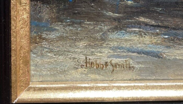 Het bijzondere schildertalent van Hobbe Smith (Witmarsum 1862 – 1942 Amsterdam) werd onderschreven door een vermogende beschermheer, die hem samen met een Koninklijke Beurs, in staat stelde om een opleiding te volgen aan de Rijksakademie voor Beeldende Kunsten in Amsterdam. Daar kreeg hij onder meer les van hoogleraar August Allebé. Hierna studeerde Smith aan de Koninklijke Academie voor Schone Kunsten van Antwerpen, waar hij werd onderwezen door de beroemde schilder Charles Verlat. Het oeuvre van Smith is zeer divers en bestaat voornamelijk uit zee- en stadsgezichten, figuurstukken, naakten en Hollandse landschappen. Maar ook stillevens, portretten, historiestukken, binnenhuizen en molens waren onderwerpen waar Smith zich mee bezighield en met een losse impressionistische toets op het doek zette. In 1917 werd zijn werk bekroond met een gouden medaille, die hij kreeg uitgereikt door koningin Wilhelmina. Smith was lid bij diverse kunstenaarsverenigingen, waaronder Pulchri Studio in Den Haag, Arti et Amicitiae en de Kunstenaarsvereniging Sint Lucas te Amsterdam. Werk van Hobbe Smith bevindt zich onder andere in het Rijksmuseum Twenthe, het Drents Museum en het Fries Scheepvaart Museum.