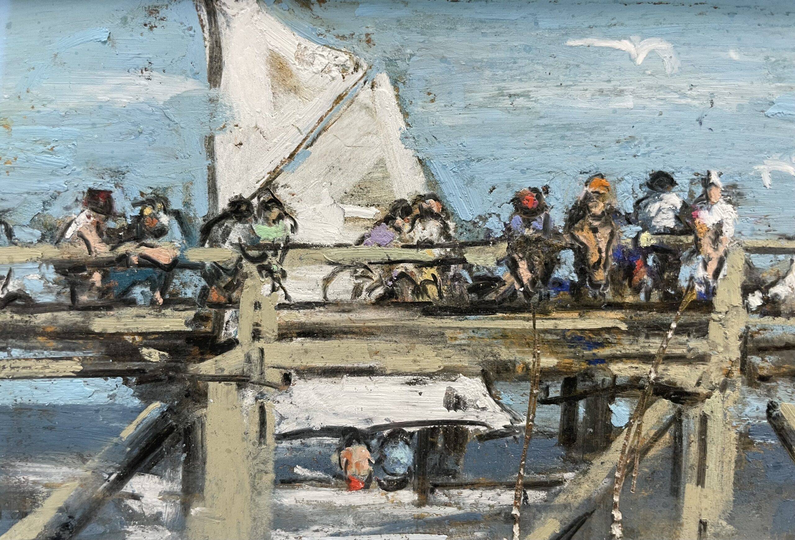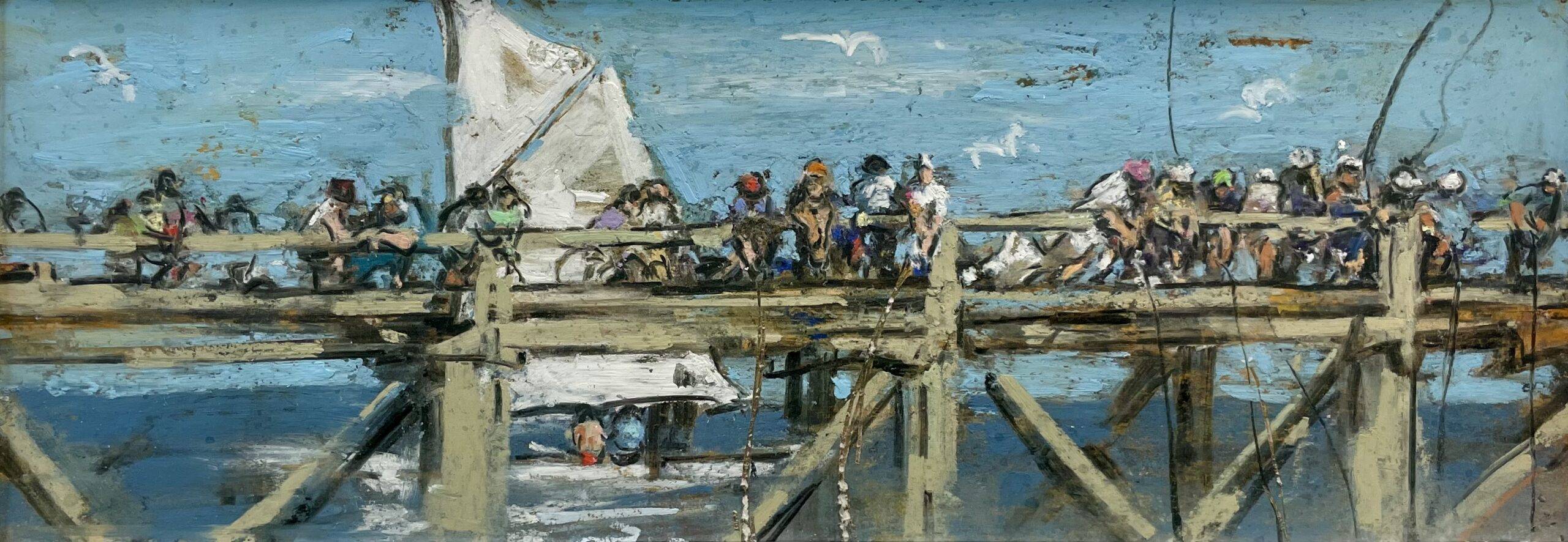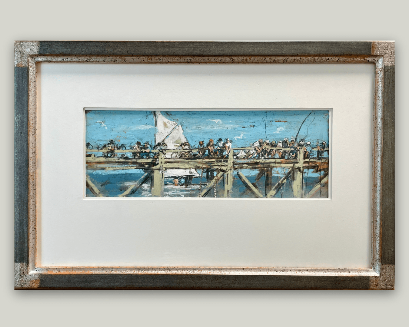 Onno Boerwinkel (Middelburg, 1950) studeerde in 1975 af aan de Rijksacademie van Beeldende Kunsten in Amsterdam. Na aanvankelijk grote olieverfschilderijen te maken, legde hij zich vanaf het midden van de jaren tachtig toe op pastel. Met zijn eigenzinnige ‘sgraffito’-techniek – waarbij lagen pastel worden opgebouwd, gefixeerd, gekrast en uitgeveegd – weet hij schilderen en tekenen op bijzondere wijze te verenigen. Het resultaat is een levendig, gelaagd beeld, waarin losse contouren zijn kenmerkende handschrift vormen. Een van Boerwinkels kenmerkende onderwerpen zijn verstilde momenten uit het mediterrane leven. Vooral Italië en Frankrijk vormen een onuitputtelijke inspiratiebron: plekken waar de tijd stil lijkt te hebben gestaan en tradities nog voelbaar zijn. Zijn werk ademt een romantische verbondenheid met de negentiende en vroege twintigste eeuw, maar is tegelijkertijd geworteld in het hier en nu. Boerwinkel vangt alledaagse taferelen met een scherp oog voor sfeer, kleur en licht. Hij nodigt de beschouwer uit om stil te staan bij het tijdloze en het herkenbare, en weet zo keer op keer een blijvende indruk achter te laten.