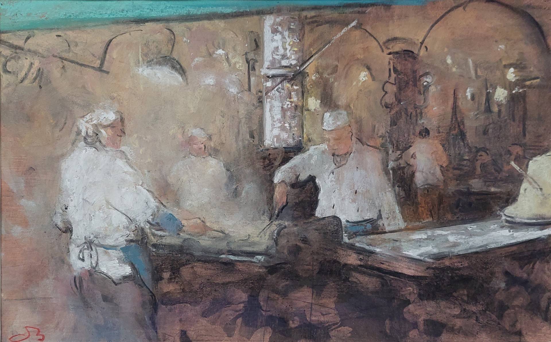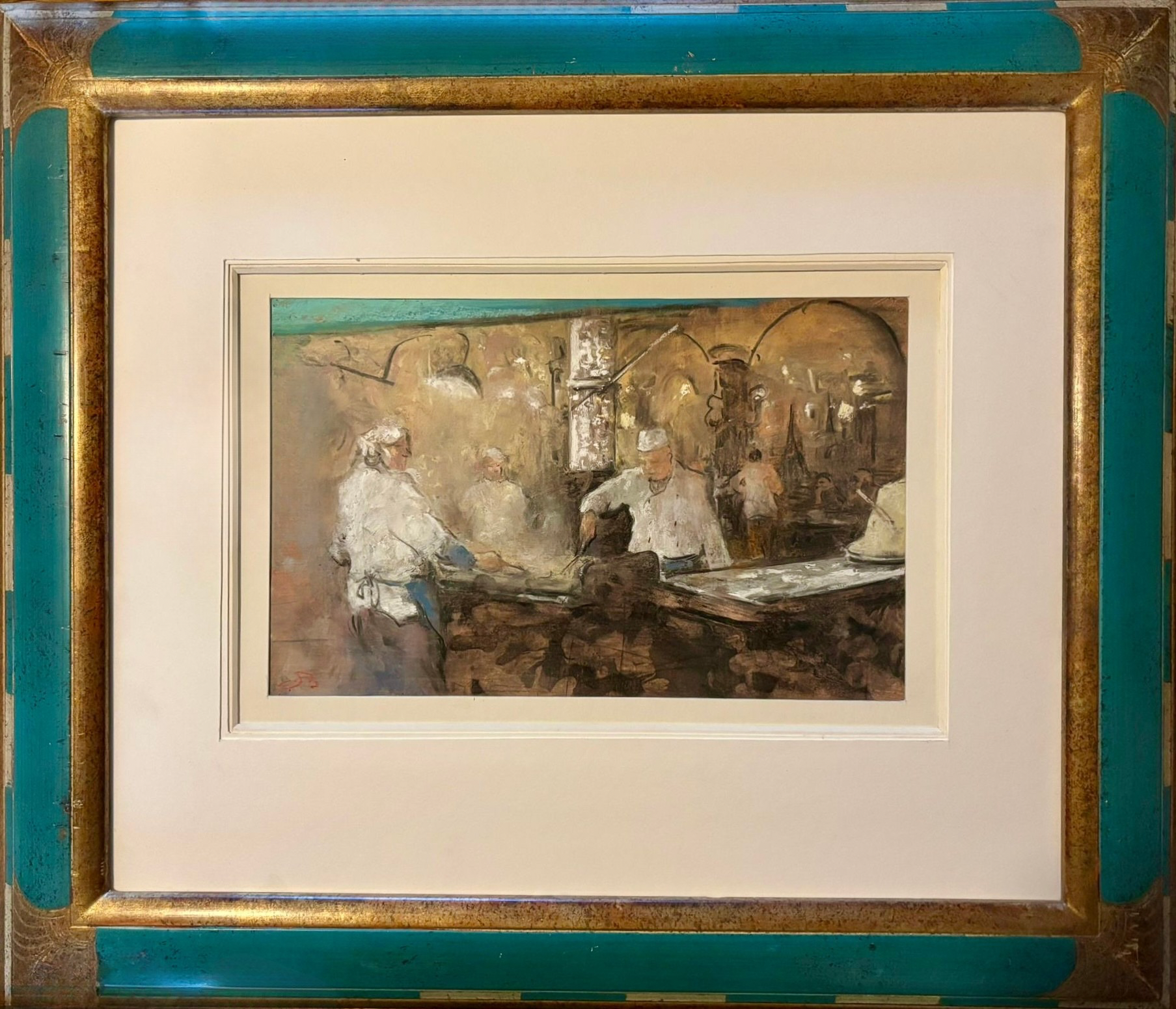 Onno Boerwinkel (Middelburg, 1950) studeerde in 1975 af aan de Rijksacademie van Beeldende Kunsten in Amsterdam. Na aanvankelijk grote olieverfschilderijen te maken, legde hij zich vanaf het midden van de jaren tachtig toe op pastel. Met zijn eigenzinnige ‘sgraffito’-techniek – waarbij lagen pastel worden opgebouwd, gefixeerd, gekrast en uitgeveegd – weet hij schilderen en tekenen op bijzondere wijze te verenigen. Het resultaat is een levendig, gelaagd beeld, waarin losse contouren zijn kenmerkende handschrift vormen. Een van Boerwinkels kenmerkende onderwerpen zijn verstilde momenten uit het mediterrane leven. Vooral Italië en Frankrijk vormen een onuitputtelijke inspiratiebron: plekken waar de tijd stil lijkt te hebben gestaan en tradities nog voelbaar zijn. Zijn werk ademt een romantische verbondenheid met de negentiende en vroege twintigste eeuw, maar is tegelijkertijd geworteld in het hier en nu. Boerwinkel vangt alledaagse taferelen met een scherp oog voor sfeer, kleur en licht. Hij nodigt de beschouwer uit om stil te staan bij het tijdloze en het herkenbare, en weet zo keer op keer een blijvende indruk achter te laten.